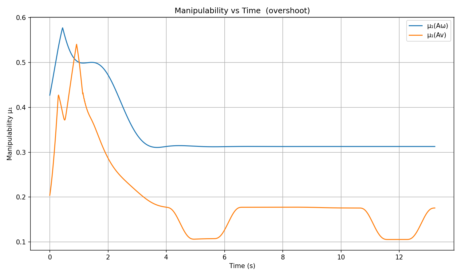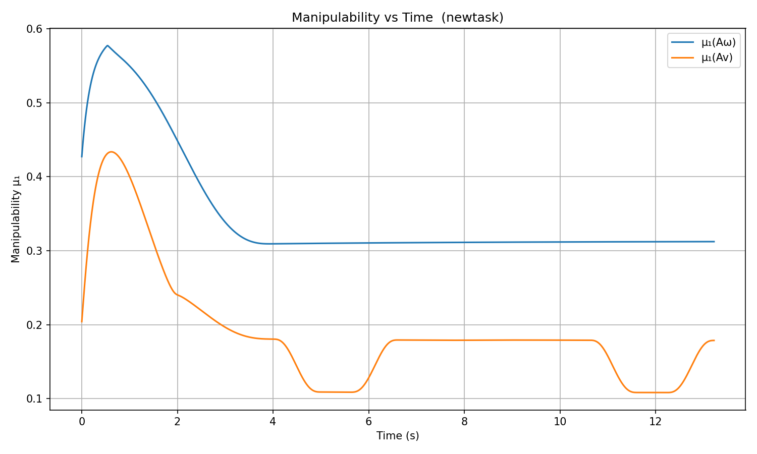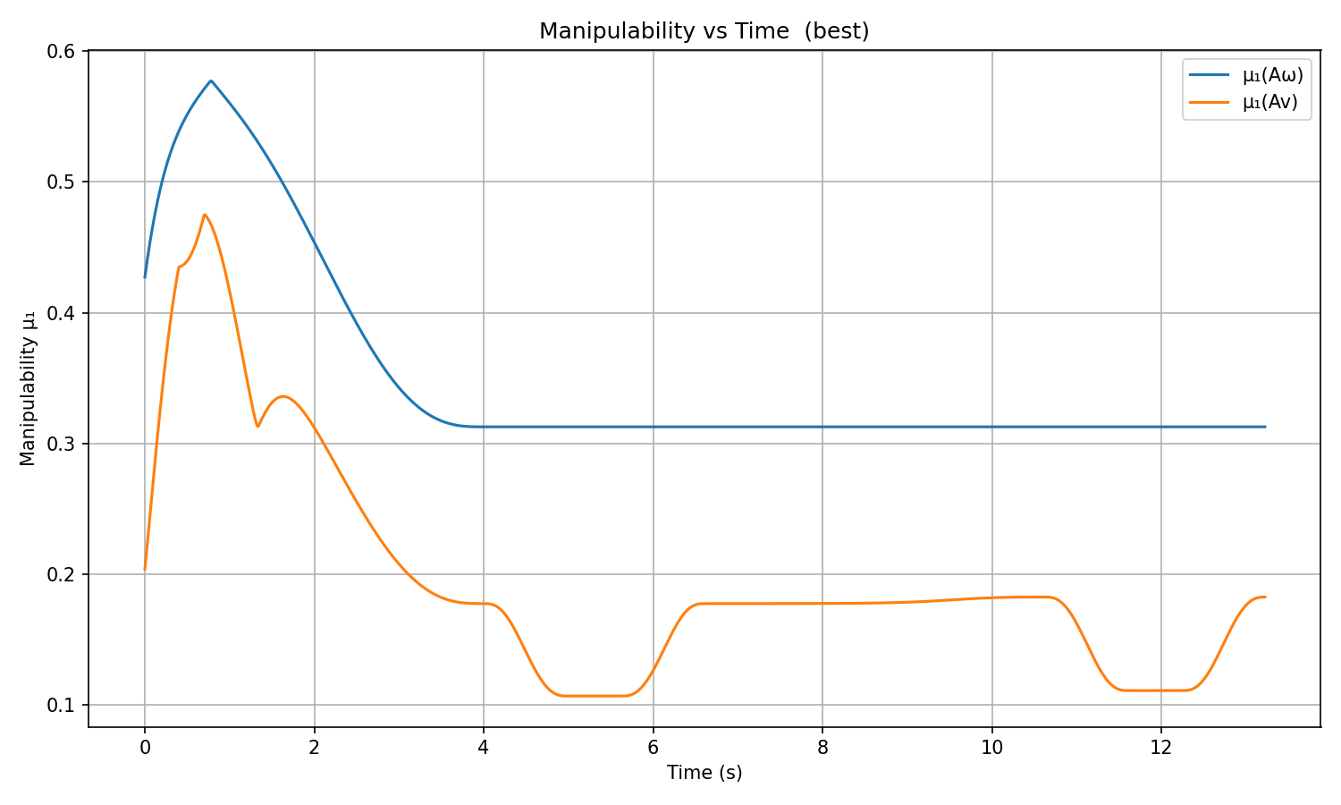 - Manipulability: ΞΌβ(Av) drops near 0.1 during grasp/place approach (arm near full extension β near-singular Jacobian), then recovers during transport. ΞΌβ(AΟ) stays near 0.31 during steady-state motion.