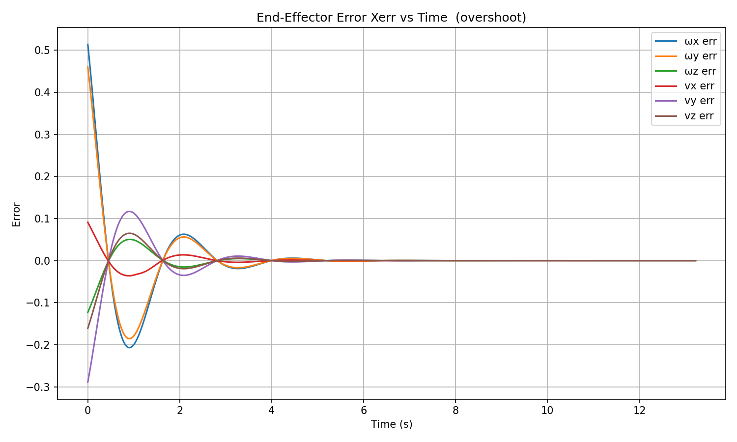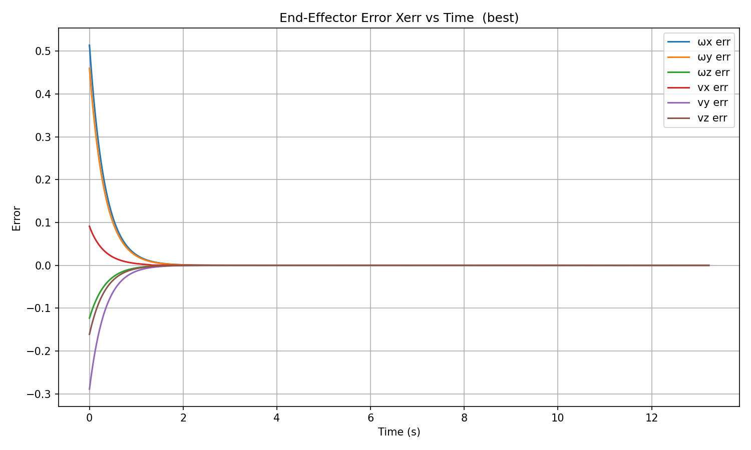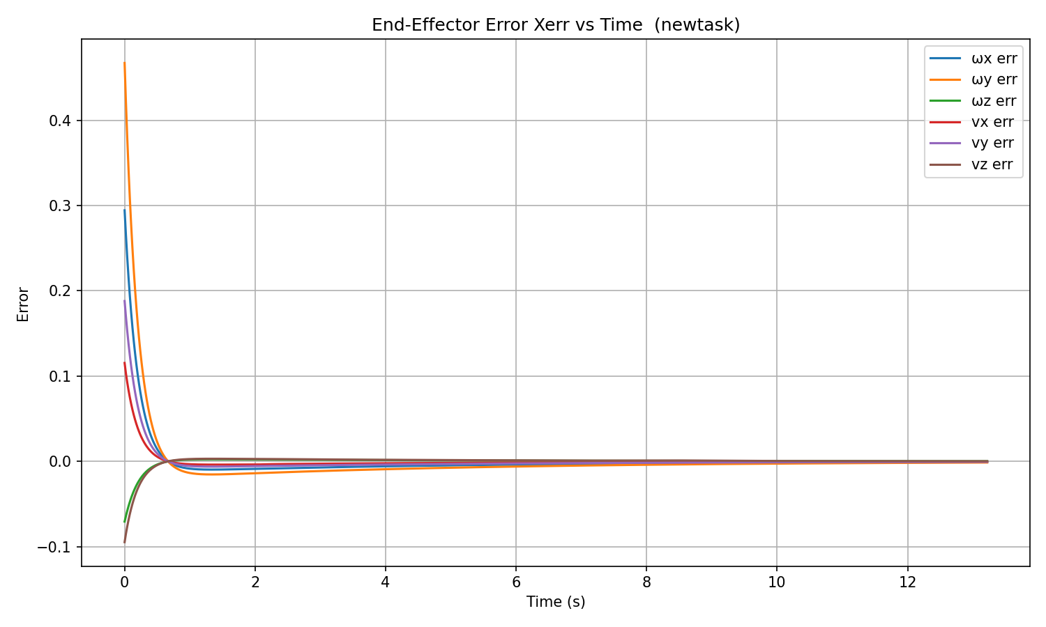 All six error components converge smoothly and monotonically to zero within ~2 seconds, with no overshoot. The error constant of ~0.33 s ensures full convergence well before the grasp at t β 5 s.